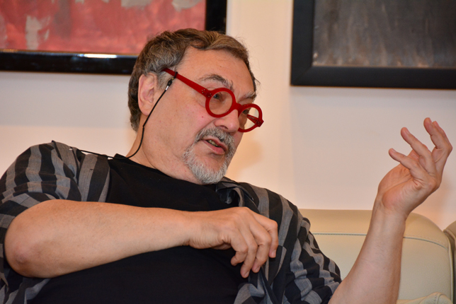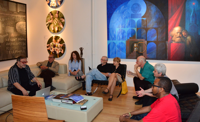 The gallery organized a lecture and artist talk, by the painter and performance artist Vitaly Komar. In "My Experience as an Artist in Russia and in the West" Vitaly described himself as a man of duality. Born in the USSR in 1943 and living in the U.S. since 1978, Komar identifies as half Russian and half American. In fact, most of his artistic career has been as half of a duo, for from the 1960s through 2003, Vitaly Komar worked with artist Alex Melamid as the artistic duo Komar and Melamid. Together, they founded the Sots Art (Soviet Pop and Conceptual Art) movement in Russia, which co- opted the visual language of official Soviet state-sponsored art and propaganda.