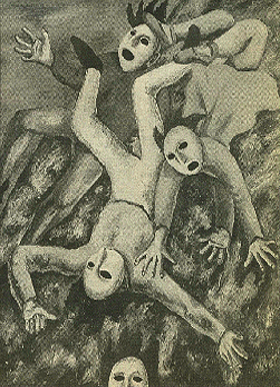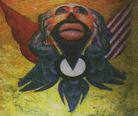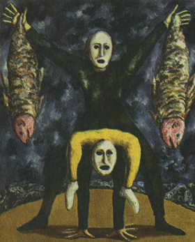 Leonid Lamm ("Self-Portrait") was imprisoned in the former Soviet Union"He was one of the leaders of the Russian [early 20th-century) avant-garde," says Mr. Gertsman. "He' did a lot of the designs for the Diaghilev ballets in France that traveled all over the world, and he is a name that Americans know." The show is appropriate for Evergreen "as a reflection both of the collecting tastes that formed the Evergreen holdings, and of the international interests of the Garrett family," writes Lili Ott, director of Evergreen, in "the exhibit's catalog. Making Evergreen especially appropriate is the fact that the four artists are indebted to earlier 20th-century art movements, including the Russian avant-garde of such now world-famous artists as Aleksandr Rodchenko, Kasimir Malevich and Wassily Kandinsky. Mr. Filatov’s work recalls the futurists, Mr. Lamm and Ms. Nesterova have roots to some degree in surrealism, and Mr. Nemukhin's art has been linked to that of Malevich and Kandinsky. Of the four, only Ms. Nesterova still lives full-time in the former Soviet Union, in Moscow. Mr. Nemukhin divides his time between Moscow and Cologne, Germany. Mr. Lamm and Mr. Filatov are now in New York, but their work in this show reflects the concerns they had as artists in Russia. Mr. Lamm - imprisoned in the Soviet Union for three years after applying for an exit visa in the 1970s- says his works from the "Seventh Heaven" series are concerned with "a dream of flying away from a 'paradise' with cruel rules and the hope to know another paradise. They evoke the dream about another system which is more human." And Mr. Filatov, speaking through his wife, Natasha, as translator, says his work combines elements of futurism with "the sad irony about the utopian products of Russian “modernism” and the dilemma between the rational and the emotional, "which may be the dilemma of the whole of modernism.